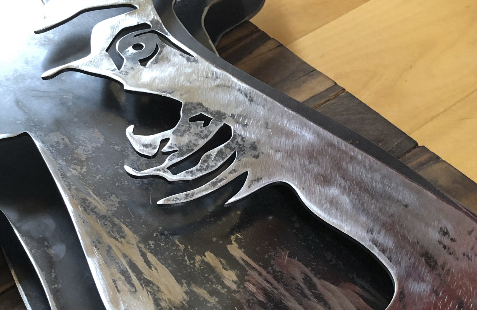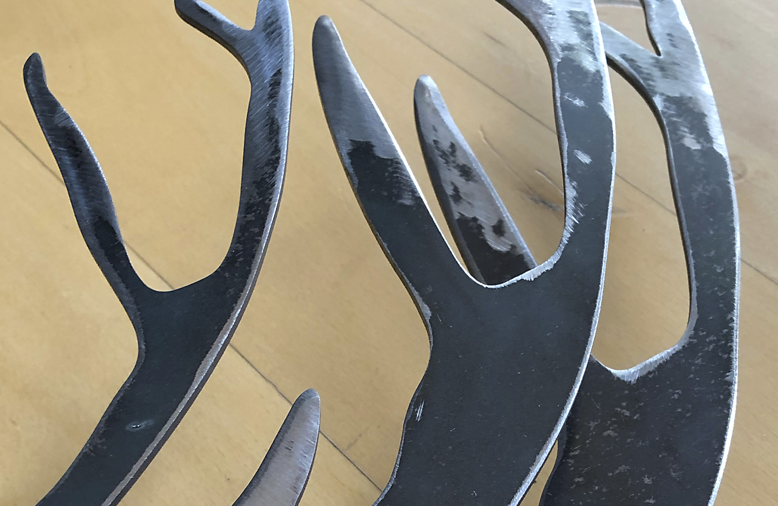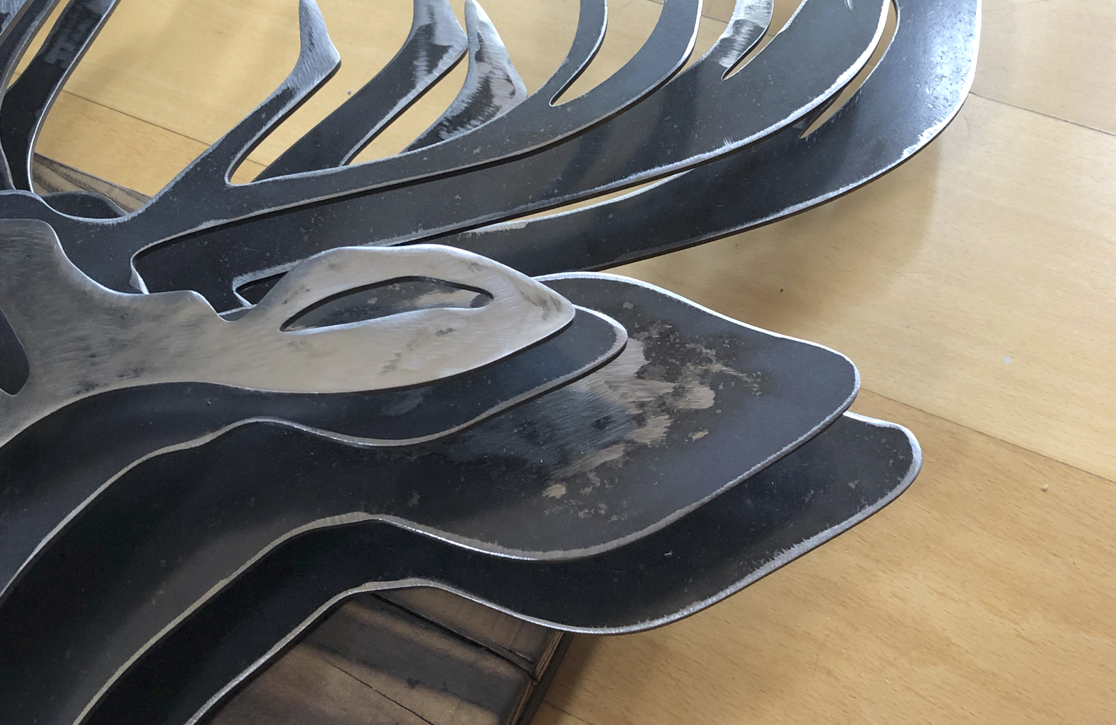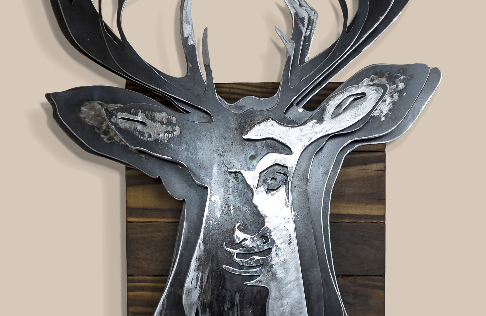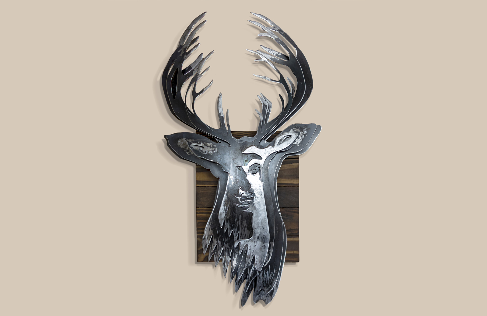 There are few animals more iconic of Scotland than the Highland Stag – the European Red Deer. Both Ireland and Scotland have their sub-species (Scotland: Cervus elaphus scoticus). Its antlers, which resemble the branches of a tree, are an emblem of the regenerative and cyclical pattern of nature — they grow throughout the summer. They are used in the rutting duels in the autumn and drop off in the winter, only to grow again next spring. This is a layered mild steel sculpture mounted on a burnet pallet wood frame.